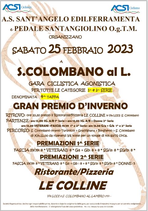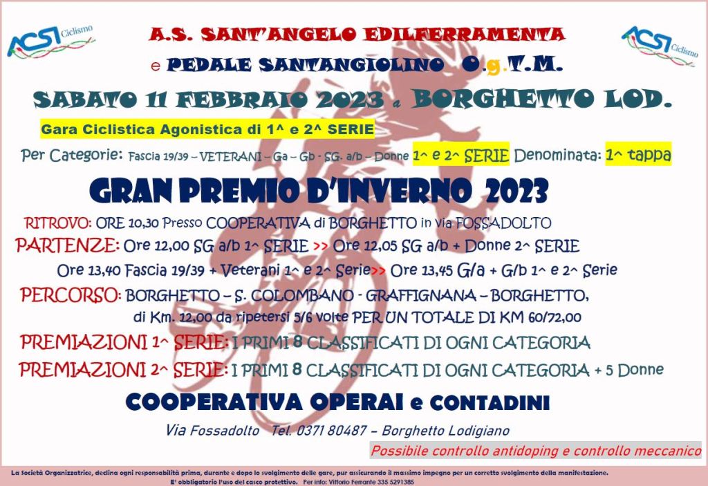 Iniziamo a far girare la gamba nelle kemesse a circuito ! Si ricomincia l’11 Febbraio con la prima delle 8 tappe del G.P. d’Inverno 2023. Vi aspettiamo !