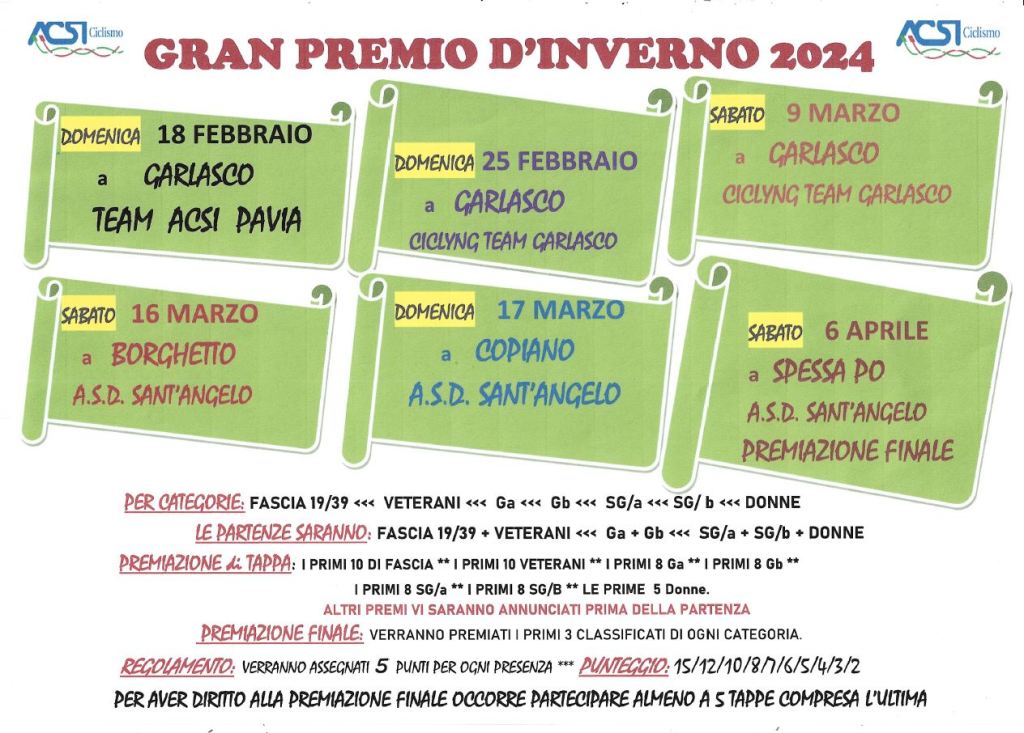 Per questa ragione il tradizionale Gran Premio d’Inverno di kermesse a circuito sara’ composto da 6 tappe organizzate da altre societa’ del Comitato Acsi Ciclismo di Pavia, di cui il nostro Presidente Vittorio Ferrante e’ responsabile.