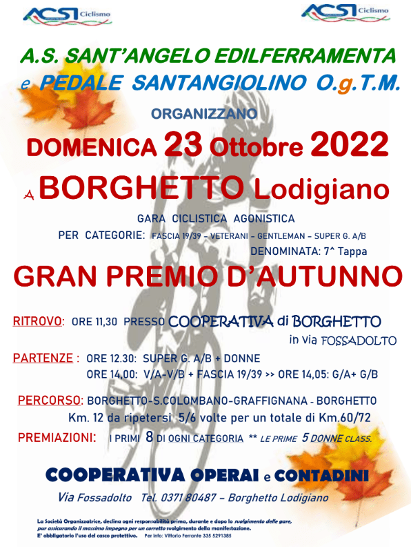 San Colombano al Lambro – 15 ottobre 2022 – Ordini d’arrivo e classifiche aggiornate Gran Premio d’Autunno